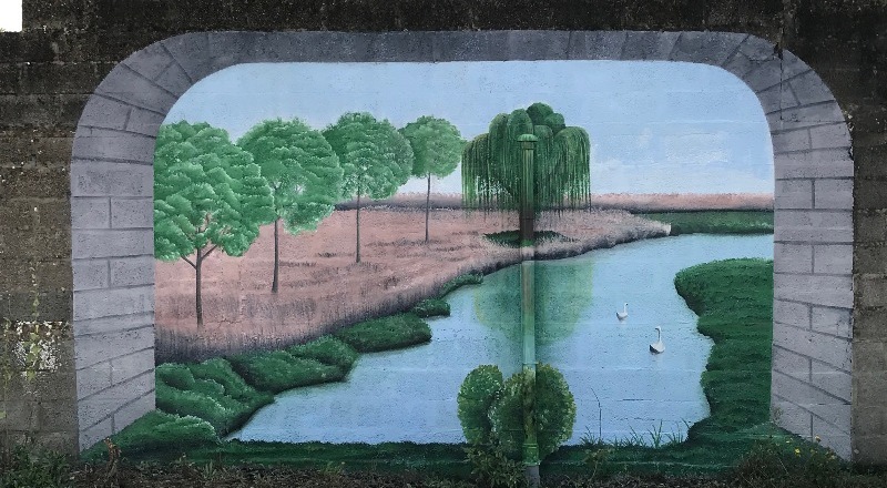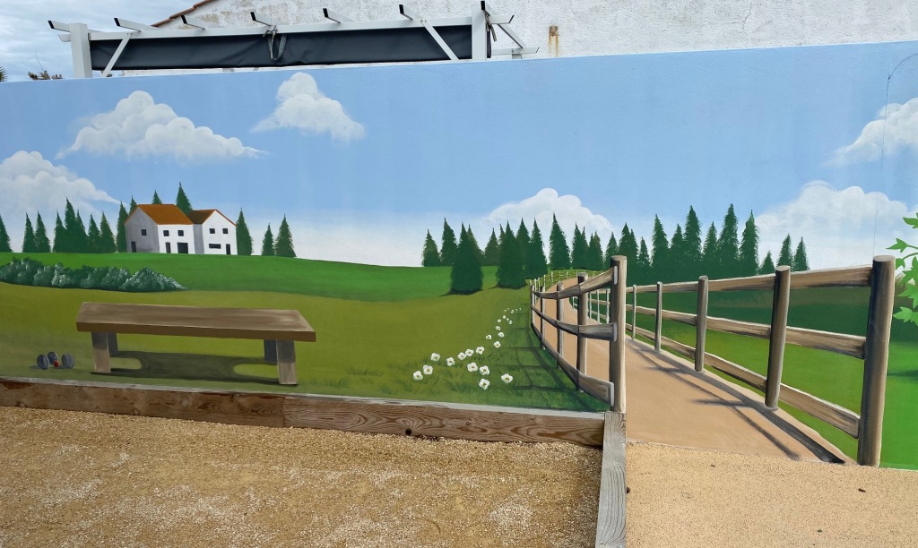 Fresque en trompe l'oeil terrain de pétanque avec faux chemin de campagne. Réalisation à Saint jean de mont, Vendée.