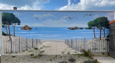 Fresque en trompe l'oeil d'un bord de plage avec chemin de ganivelle. Réalisation aux Sables d'Olonne, Vendée.