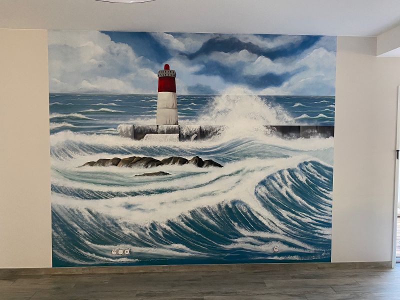 Fresque en trompe l'oeil intérieure salon mer avec vagues et son phare. Réalisation st hilaire de riez, Vendée.