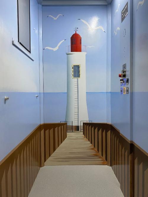 Fresque en trompe l'oeil dans ascenseur avec faux ponton et phare . Réalisation aux Sables d'olonne, Vendée.