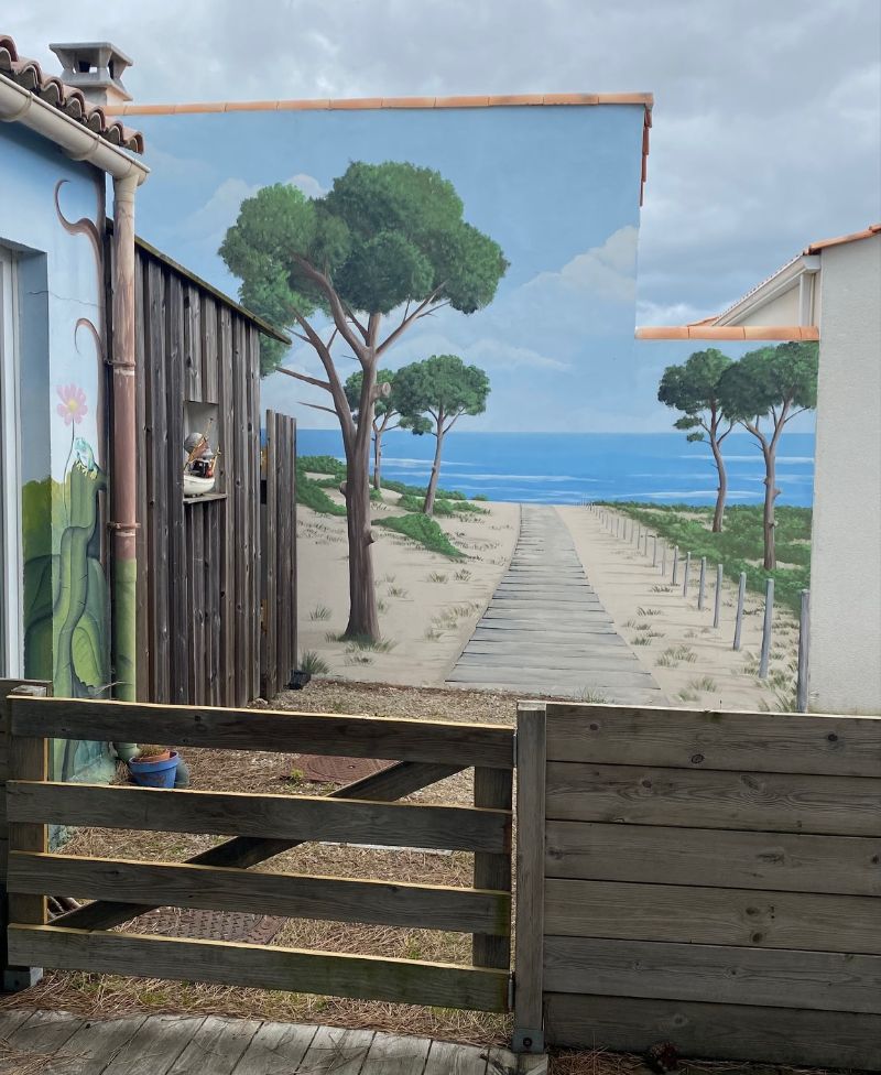 Fresque en trompe l'oeil d'un bord de plage avec chemin de ganivelle. Réalisation à Brétignolles sur mer, Vendée.